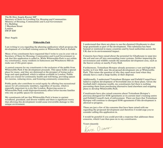 On 14th July 2025, the Mayor of London declined to intervene in Spurs' planned development of Whitewebbs Park in Enfield, North London. Spurs seek to build an elite 10 pitch women's training academy, adjacent to its 17 pitch men's training centre. The development, which would result in a consequential loss of public and biodiverse green space, now looks set to go ahead despite strong opposition, both from locals and from people across the country. The decision not to direct refusal of permission comes in spite of over 1200 representations made to the Mayor (see document below), plus more sent to the Council (these were provided to the Mayor).